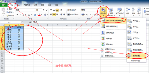2、打开您需要进行处理的excel文件,并且选择您需要处理的数据。选中之后在菜单中点击“开始”,出现的选项卡里选择“条件格式”,然后再下拉菜单中选择“突出显示单元格规则”,然后再下一步选择“重复值”选项;