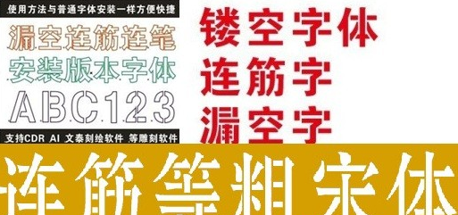 连筋字体,又称镂空字体(漏空字),是主要可用于镂空,雕刻,条幅,喷漆效果设计方面的字体。可用于任何刻绘、雕刻及排版软件(如《文泰》、《刻绘大师》、《CorelDraw》、《AutoCAD》等等)。