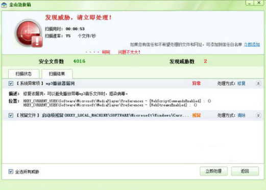 流行0day漏洞免疫,针对最流行的漏洞进行快速准确免疫(将不断关注流行漏洞并添加免疫修复)当前支持扫荡波(ms08-67),ie xml 0day(ms08-78)漏洞免疫.该产品不能替代金山漏洞扫描功能,其他漏洞请下载清理专家修复。