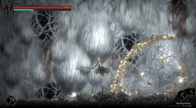 在人物攻击动作上,每类武器都细心设计了超过 10 种的攻击动作与连击招式,配合技能道具与升级系统,玩家将可自由组合出专属自己的攻击流派,用实力与暗黑力量一决胜负。但道高一尺,魔高一丈,游戏内每只怪物也有三种以上的出招方式,在尽情攻击时可得要睁大眼睛,以免冷不防的偷袭夺去你的小命。另外值得一提的是,此次游戏开发邀请到来自北欧死亡重金属乐团 Whispered 吉他手 Jouni Valjakka 协助作曲,他以大量的管弦乐元素,融合黑魂与恶魔城系列,谱出带有诡谲气氛的 BGM,绝对是在视觉震撼外不可错过的突出元素。