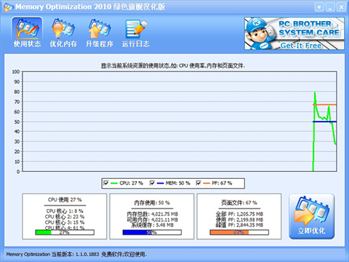 如果你想随时看到内存的使用情况,虽然想在内存占用过多的时候优化一下内存,那么这款Memory Optimization可以满足你的要求,它能直观的显示内存历史的使用曲线,包括cpu占用曲线和物理内存使用曲线,以及页面文件使用曲线,而其中的优化内存的功能主要是清理内存垃圾,降低注入内存的无用程序,从而让电脑会因为内存占用过大而卡顿。