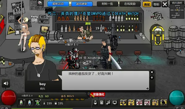 1.闪客快打7佣兵帝国游戏画面下方有四个图标,从左至右依次为道具栏、任务栏、音乐、系统设置。