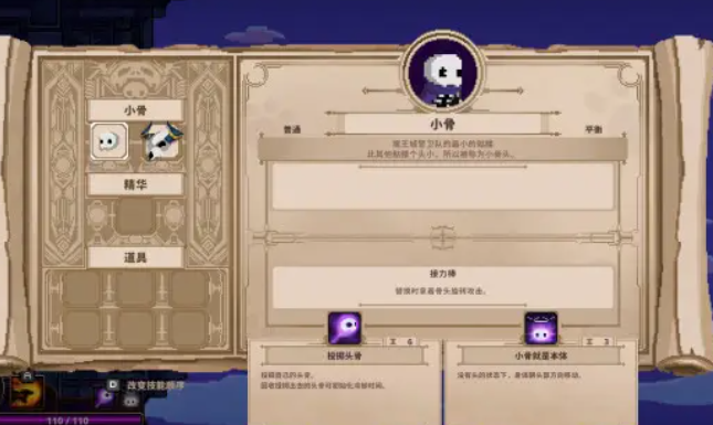 每种职业一般都有一些特殊的被动效果以及一到两个小技能,小技能使用时不消耗资源但有 CD 时间,有些也能积攒几次方便玩家连续使用。这些一般都是攻击技能,但偶尔也会遇到「战狼」自带的无敌小跳等移动能力。另外需要注意的是,哪怕拾取到的是相同的「头骨」,但获得的小技能并不固定,一般会在 2 种之间随机切换,比如石像鬼头骨就有小跳砸地和硬化之后短暂无敌两种,冰川小骨也有发射冰飞镖和把自己冻起来两种,具体获得哪个技能完全随机,给游戏过程带来更多的变化。