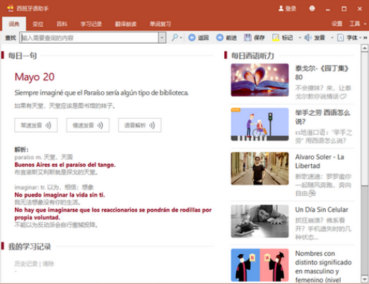 《西语助手破解版》这款软件拥有全新的界面,让用户的使用体验更加的爽快,西语助手电脑版这里是为西班牙语学习者特别设计的语言学习软件,这里有为用户准备的西汉、汉西、西西、西英词典、动词变位查询、西班牙语发音等功能,是用户学习西班牙语不可缺少的一款软件,关键是这款软件还支持PDF格式文档的取词、收录了大量的词条,还能够提供云同步功能,让用户随时随地的想学就学,用户遇到不懂的还可以有智能的解析,十分的方便快捷。