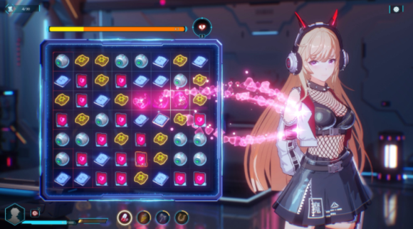 在FBRP研究所还会有益智小游戏需要玩家完成解密,把三个颜色相同的物品连成一条直线即可消除。在一定回合限制内,达到指定的目标即可通关解锁新剧情分支。