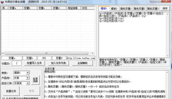 6、可以批量导入多条任务,格式:变量a|变量b|变量c|变量d|商品链接 一行一个,点击批量任务软件会将生成文章自动保存到文章库文件夹内。
