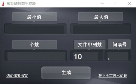 3、下载并安装完随机数生成器,双击打开主界面,设置“最小值”“最大值”“个数”“文件中列数”“间隔号”之后,点击“生成”按钮;