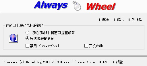 AlwaysMouseWheel-鼠标增强类软件,能将鼠标滚轮键添加滚动活动窗口,让你使用鼠标滚轮激活任何非活动窗口。