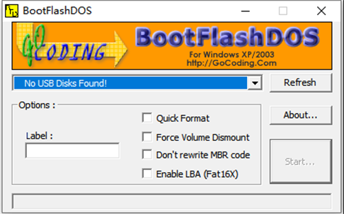 下载解压后直接运行bootflashdos.exe,它将自动检测u盘,你只需要插上u盘并点击start按钮,即可做完一切(u盘将被重新格式化,请做好备份)。