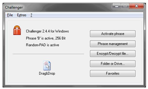 无论挑战者是安装在硬盘上还是作为便携式版本进行正常的多用户操作,在两种情况下,都可以加密每个数据载体上的所有文件类型。加密的文件可以安全地存储在网络或在线驱动器上。即使诸如Microsoft或Google之类的提供商保证对在线硬盘进行集中控制的加密,您也可以使用Challenger拥有自己的工具。
