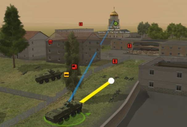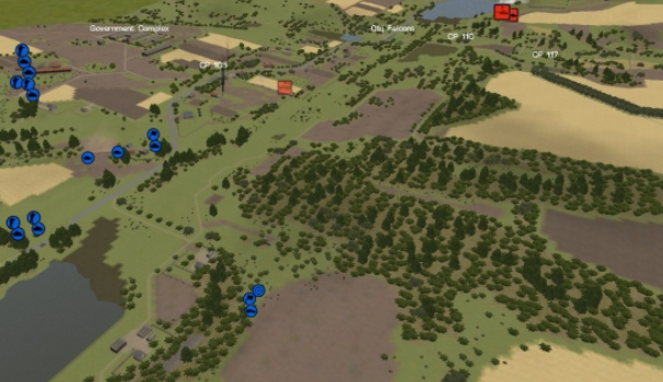 5、右侧高地的侦查小队和T72B3坦克排向山下突击,配合右侧先前监视树林的装甲步兵排占领树林。后方留下的跟进并配合坦克排像小镇右侧迂回并之后像小镇内部攻击,占领小镇,完成主要作战任务。