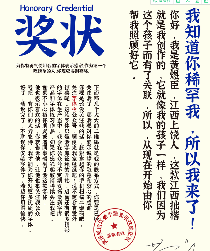 江西拙楷体是一个手写风格的楷书字体,从去年开始免费可商用,你完全不用担心版权问题,或者造成严重的后果。可商用字体没有后顾之忧,到现在大概有十几款免费可商用字体可供大家使用。黄煜臣的楷书设计的字体。今天小编再给大家分享一套免费可商用古风字体下载,它就是江西拙楷体,它是黄煜臣先生个人开发的第一套古风中文字体,免费可商用。
