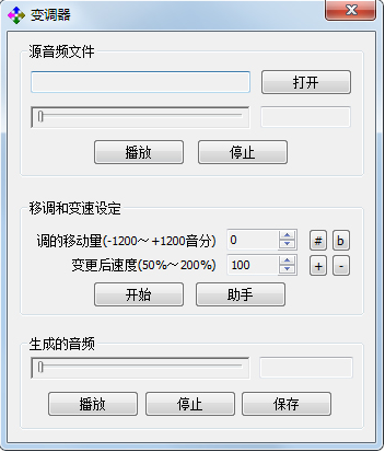 Pitcher(变调器)可以修改音乐播放音调的工具,倍数播放,慢速度播放音频等都可以实现,变调器只可以对mp3 或wav文件变调。使用Pitcher打开音乐文件后,按“#”,“b”设定变调的半音个数。一个半音为100音分,完成设置后点击“开始”按钮即可开始变调,变完以后可以听一下,觉得可以的话就可以保存起来了。