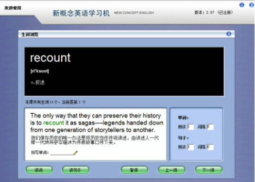 4、【课文初记】:以句子为单位去学习和理解整篇课文,每条句子都配有译文和真人读音,可自由设置每句的朗读次数和间隔时间,课文中的重点和难点句配有详细的注释,您也可以自行为句子添加注释,点击句中单词即可查看词义和音标,并有标准纯正的真人发音,通过鼠标点击还可将句中的任意单词设为生词,用于以后集中进行学习。