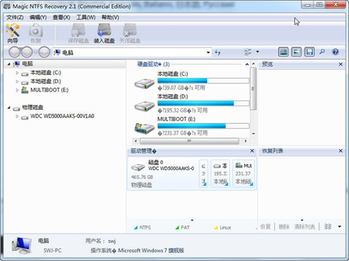 magic ntfs recovery免费版为用户提供非常好用的数据恢复功能,而且对ntfs格式的文件恢复起来有特别专业的效果,不同的模式下针对出来的更加的优秀,Magic NTFS Recovery是一款专业高效的格式化数据恢复工具。功能强悍,能够帮助用户快速恢复因硬盘格式化造成丢失的数据。软件操作简单,造成从所有NTFS文件系统的格式化硬盘中恢复数据。