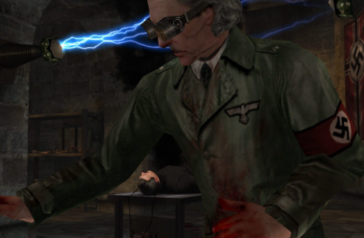 潜入敌人领土摧毁大规模杀伤性武器。故事发生在第二次世界大战期间一个虚构的德国城市。游戏中的敌人和我都穿着同盟国和轴心国的服装。武器当时也被证实有枪支和装备,但这次有一些神秘的阴谋。在单人模式中,玩家扮演的角色B.J.Blazkowicz,一个盟军突击队。玩家的任务是潜入位于山区的德军总部,调查德军的实验,以召唤亡灵、黑暗骑士和其他邪恶力量。