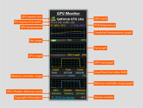 gpu monitor免费版的功能很单一,很小巧,使用起来非常的方便。对于电脑的用户来说只有一个功能就是实时监视电脑的显卡信息。不管是哪一方面的波动都是可以尝试的,GPU Monitor是一款绿色小巧,方便实用的显卡监视工具。运行程序之后,它能够实时监测本机显卡详细参数,包括:风扇、GPU负载、使用、游离的和总的虚拟内存等信息。可适用于windows 7和windows vista操作系统。支持nvidia或amd/ati显卡。体积非常的小巧,能够实时反映显卡的情况,方便易用,支持中文,有需求的用户请下载使用!