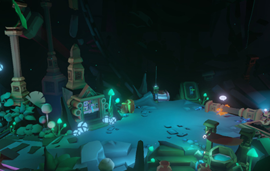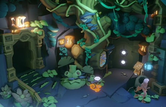 3、点击左下发光的蘑菇,出现藤桥,然后与左边台阶上的机关互动。