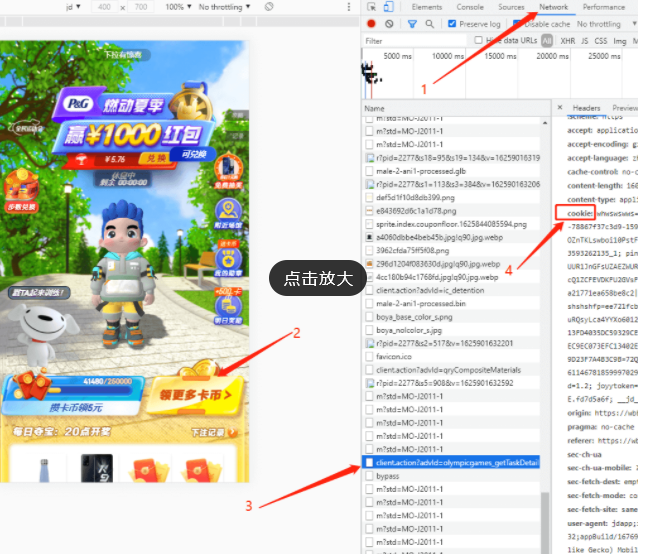 4、登录后,点击network,然后活动中的任务列表,在network中找到那个请求的接口,把Headers 中的Cookie复制出来