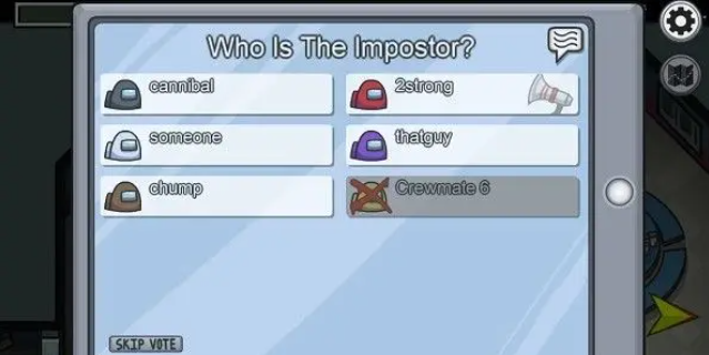 投票可以根据讨论指定投给某个玩家,也可以在局势不明朗的时候跳过投票,得票数最多的用户(或者跳过投票最多的)为本轮讨论的唯一结果,如果某个玩家得票数最多,则该玩家被扔出局,如果跳过投票的人数最多,则本轮没有玩家被扔出airlock。