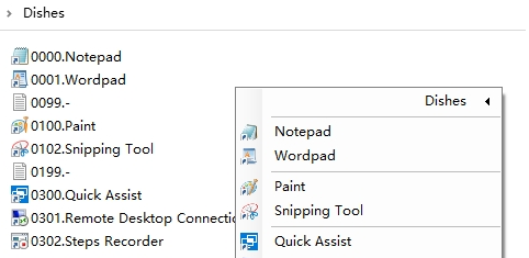 你可以把任何快捷方式、批处理或是可执行文件放进这个文件夹,点击 Dishes -> Refresh 刷新后,它们就会出现在 Dishes 的右键菜单里。
