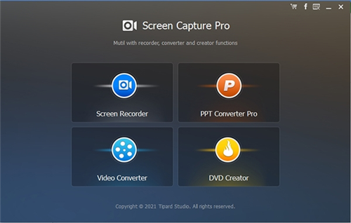 Tipard Screen Capture Pro 由 Screen Capture、PPT to Video Converter、Video Converter、DVD Creator 和 Blu-ray Creator 组成。它是最好的多合一视频工具,可让您记录屏幕活动、转换视频、创建/刻录 DVD/蓝光光盘并将 PowerPoint 演示文稿转换为视频或 DVD。