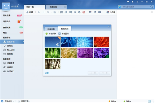 最大的变化就是新加入的“炫彩换肤”功能,通过bolt引擎使该功能可以方便直观的对主界面进行换肤操作,还能设置主界面的配色方案及主界面/任务列表的透明度,并支持windows 7毛玻璃效果。用户亦可通过直接拖拽图片到迅雷主界面的方式进行快捷的自定义皮肤设置,会自动提取背景图特征色的方式让整个界面的风格保持一致。亦可以调整界面的所有字体,换成用户自己安装的或系统自带的华文琥珀、火星文、隶书等。由于迅雷7的界面采用了独立的界面系统。vista/win7以至于winxp都能够享受玻璃效果。