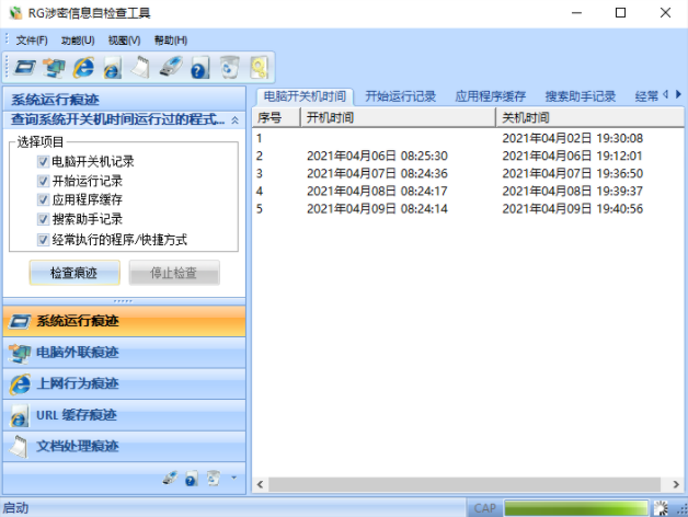 分为快速和深度两种检查方法,快速为直接读取IE浏览器缓存文件,深度检查从磁盘级搜索上网痕迹,基于数据特征和数据恢复技术,可以搜出被清除过或者重装过系统的电脑的上网痕迹。