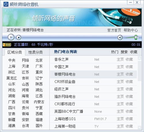 用户可选择中央、网络、北京、上海、天津、广东、浙江、江苏、重庆、黑龙江、吉林、辽宁、山东、山西、陕西、河北、河南、湖北、湖南、海南、江西、广西、云南、内蒙古、四川、贵州、宁夏、甘肃、青海、西藏、新疆、安徽、福建、港澳、台湾、国外等分类,只要点击区域分类,右侧则显示出该地区的电台列表,然后选择你要收听的电台频道就可以了。
