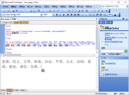 点击新建菜单命令会弹出一个对话框,有不同的模板供选择。选择你想要的一个,然后确定,会自动生成一个网站。你也可选择新建空白网页,或点新建工具按钮。当然,这上面的内容你要自己编辑。