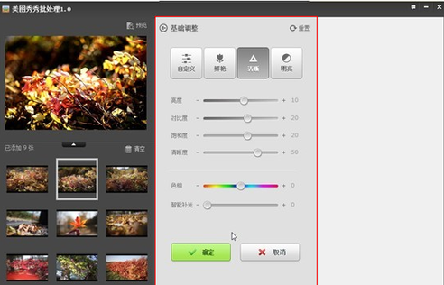在批处理基础调整功能中,分为自定义模式和设定模式(鲜艳、清晰、明亮),即用户可以自定义微调各个参数选项,给予用户最大的自由度,随自己的修图喜好把握照片的风格;同时,也可以按照软件工具的给予参数设定处理照片。当然,在设定的模式中,参数并非固定死板的,仍旧可以微调,这两种模式主要包含六项照片调整项:亮度、对比度、饱和度、清晰度、色相、智能补光,基本覆盖了一张照片曝光、层次、色彩、锐度等调整要素,考虑很周到。