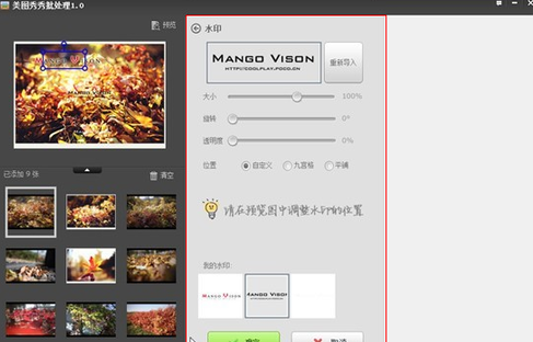 通过批处理工具的水印功能,我们能够对水印的大小、旋转、透明度以及水印位置进行自由控制,同时,在调节水印的时候,可以轻松预览,即时看到水印效果;此外,该工具有记忆功能,之前导入过的水印都留存在水印功能板块的下方,方便随时调用。