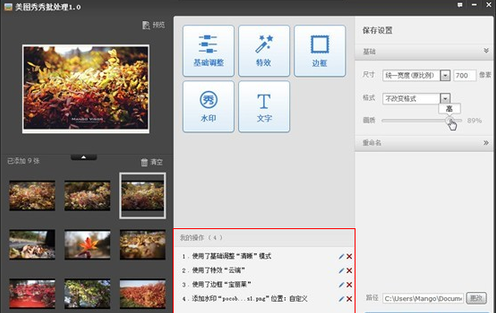 当以上的五大项批处理功能调整完毕确定时,我们需要对照片进行保存前的最后调整设定,美图秀秀批处理工具能够对照片的输出尺寸大小、照片格式、画质等级,是否重命名,存放位置进行设定。很显然,这些功能都是相当必要的,美图秀秀批处理功能怎么可能遗漏呢!最后,点击保存之后,照片的批处理功能就正式启动了,稍等片刻就能看到批处理照片的效果了!