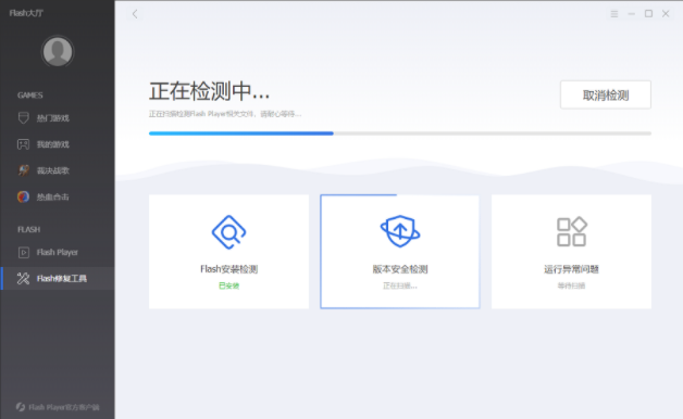 下载flash player官方修复工具进行一键修复,安装完成后打开,点击“快速检测”。
