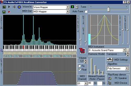 TS-AudioToMidi Converter在实时模式下,可通过你电脑的麦克风或线路输入快速转换音乐为MIDI序列,此模式常被当作一台强大的音乐处理器。你的MIDI合成器可以使一些非MIDI乐器(如吉他)的声音听起来像小提琴或钢琴或其他乐器演奏的。