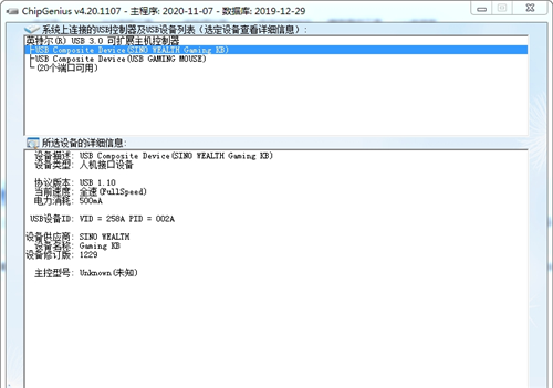 chipgenius芯片精灵是一款专业USB检测工具,深受电子爱好者、数码维修人员的喜爱。不用拆机即可查询U盘的芯片型号,自动查询U盘、MP3/MP4、读卡器、移动硬盘等一切USB设备的主控芯片型号、制造商、品牌、并提供相关资料下载地址。并支持查询USB设备的VID/PID信息、设备名称、接口速度、序列号、设备版本等。