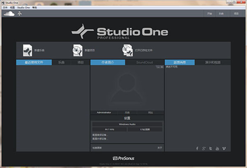 起始页是您的家庭基地,您可以在那里访问最近的歌曲和项目,或者开始新的歌曲和项目,调整硬件设置,检查您的在线进度,与最新的Studio One 3新闻保持联系,并通过演示和教程开发新技能。