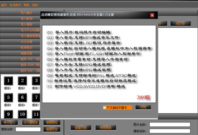 3、导入背景音乐,导入歌词(支持歌词同步显示),导入片头,导入片尾,导入模板背景素材(支持外部素材),导入模板组合(自定义模板组合),自定义模板文字(祝福语),导入FLASH动画(制作动态与静态结合的电子相册)等。