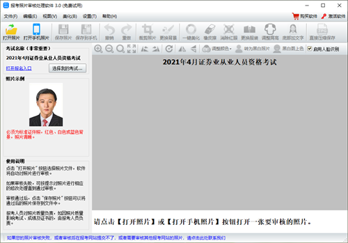 报考照片审核处理软件免费版是专业的照片处理软件,可以根据用户的选择,自动生成所需照片的参数,会计师、证券师等等全都支持,多种功能让你处理好照片,使它可以满足该类报考的要求。支持多个报名网站的照片审核处理、支持快速处理照片为标准格式证件照、支持照片裁剪、更换照片背景、一键美化、橡皮擦功能、消除红眼、更换服装、调整肩高等功能。