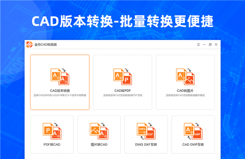 CAD版本转换,CAD转PDF,CAD转图片,PDF转CAD,图片转CAD,DWG DXF互转,CAD DWF互转;金舟CAD转换器是一款CAD文件转换处理软件, 操作简便,软件界面简洁明了,可一键批量一键操作;转换速度快,为CAD文件工作者提供便捷的CAD文件处理方案,更效率办公,本地完成转换,更安全。