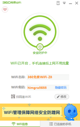 《360免费wifi电脑版》是一款免费的WiFi连接工具,360免费wifi电脑版能够为用户将自身电脑网络发散出去,其他设备能够连接网络,随时随地免费上网,不用担心手机流量了,该软件的安全性一流,需要通过密码分享,才可以连接WiFi使用,同时还可以对已连接WiFi的设备进行管理,可以看到都有那些设备连接了此网络,对于不认识的设备可以直接移除,非常的好管理。