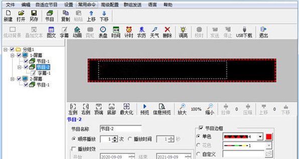 4、提供多个直观的功能面板:节目、图文、字幕、素材、酷字、时间、刪除、调亮、校时、发送、USB下载。