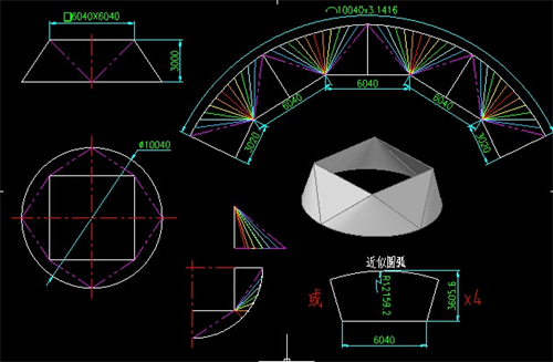 - 一通百通:一端是大圆,另一端是2~100个小圆的锥形多通管。画平面图、剖面图、单支管展开图。其等分可为12-1万。