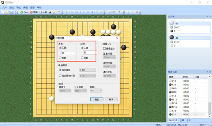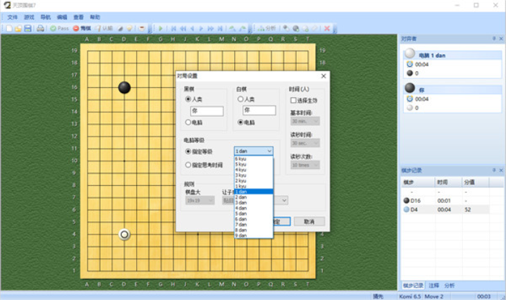 3、支持多种棋盘大小(9路至19路),可设置引擎强度、让子、贴目等,并可保存为自己的默认设置。