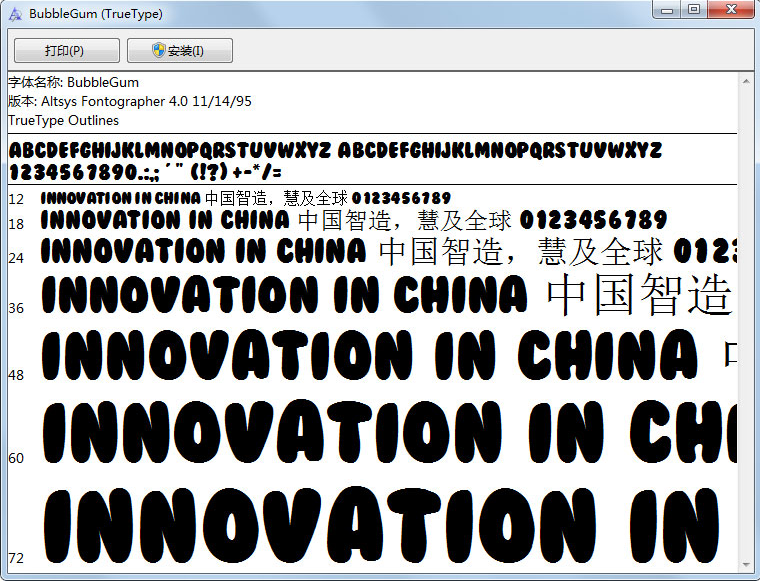 bubblegum字体是一款设计字体,可以进行商用的字体,免去了版权问题的困恼,让你用bubblegum字体没有后顾之忧,这款字体的风格就是圆圆胖胖的,嘟嘟的,全体看起来十分和谐,该字体只使用于字母和数字,十分的可爱,能够用于各种广告设计、名片设计、包装印刷、产品设计等使用,下面还介绍了安装方法。