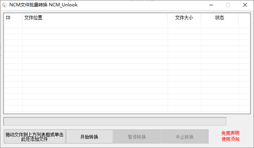 本程序为ncmdump的图形化界面,运行时会根据系统位数释放相应的程序并调用,请确保本程序所运行的目录无需管理员权限或本程序已经拥有管理员权限,否则可能出现无法写入的问题。使用时可选中全部音乐文件拖入列表框,或单击按钮选择文件,程序自动识别分辨ncm格式。