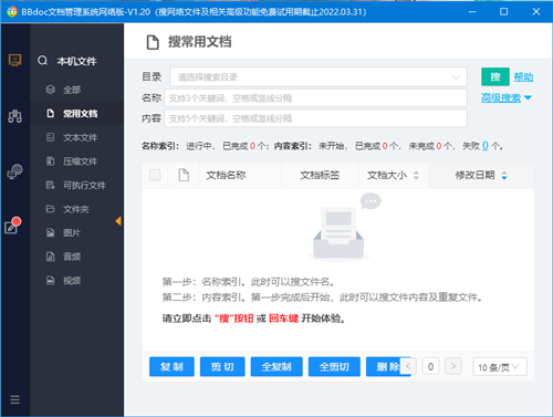 BBdoc文档搜索工具支持按照文档类型、大小、日期、名称、标签、所在目录、内容、是否重复等组合条件快速精准搜索文档,支持文档删除、预览及重复文档查找。