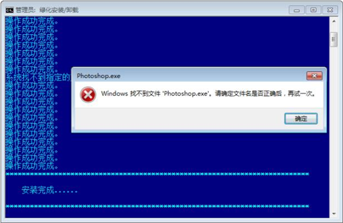 3、安装完成。(小编在虚拟机上测试提示找不到photoshop.exe,点击确定就好了,没有影响,可以正常使用)