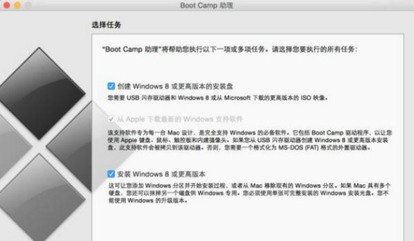 3、进入BootCamp助理选项任务界面中,您可以选择一项或者多项任务,您可以选择创建Windows7或者更高版本的安装盘、安装Windows7或更高版本或者从Apple下载新的Windows支持软件,选择完成后点击【继续】按钮。