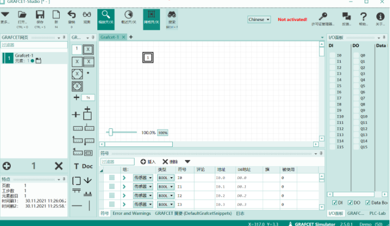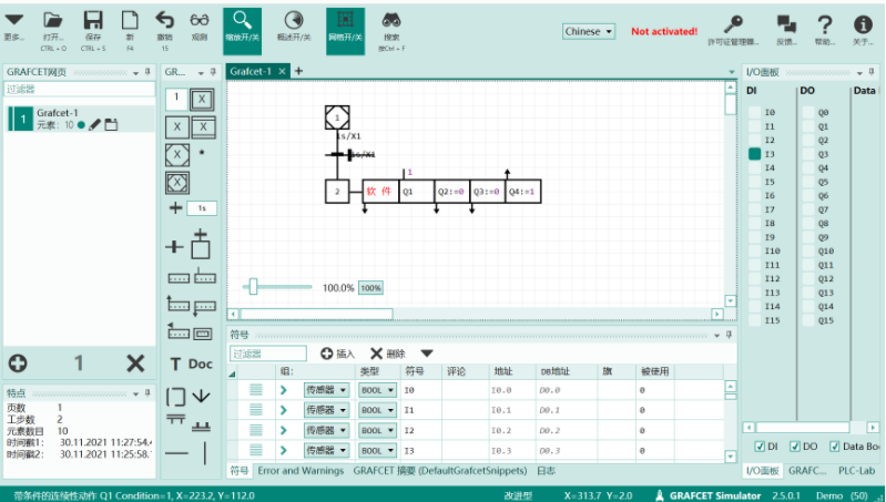 值得一提的是,Grafcet Studio 的用户界面完全面向矢量,可以随意缩放用户界面与 Grafcet 图表而不会降低质量,也就是支持放大与缩小等操作。